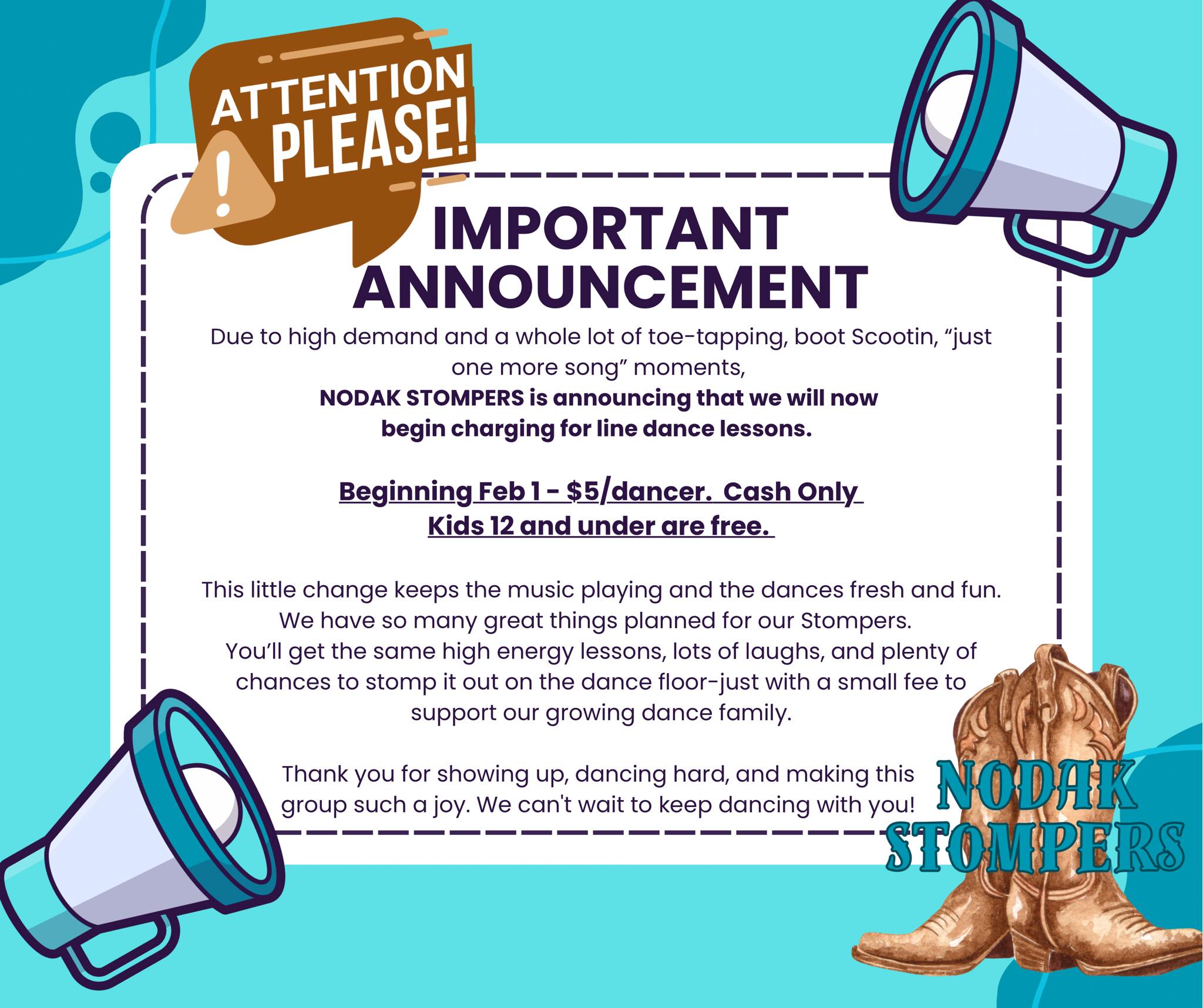 NoDak Stompers will be on the Lodge Floor providing Line Dancing Lessons from 7-9pm. This event is open to the public and starting February 2026 the company providing the lessons (NoDak Stompers) will be charging people $5 each at the door (Kids 12 and under are free).