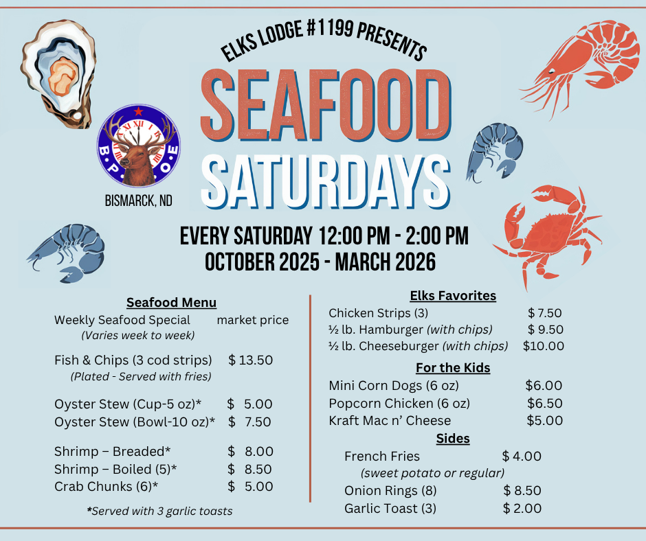 - Tips go to charity: All the tips given during Seafood Saturday get donated to the Volunteer Team’s charity of choice. The Elks Lodge matches the tip total collected each week and also donates the the teams charity of choice.